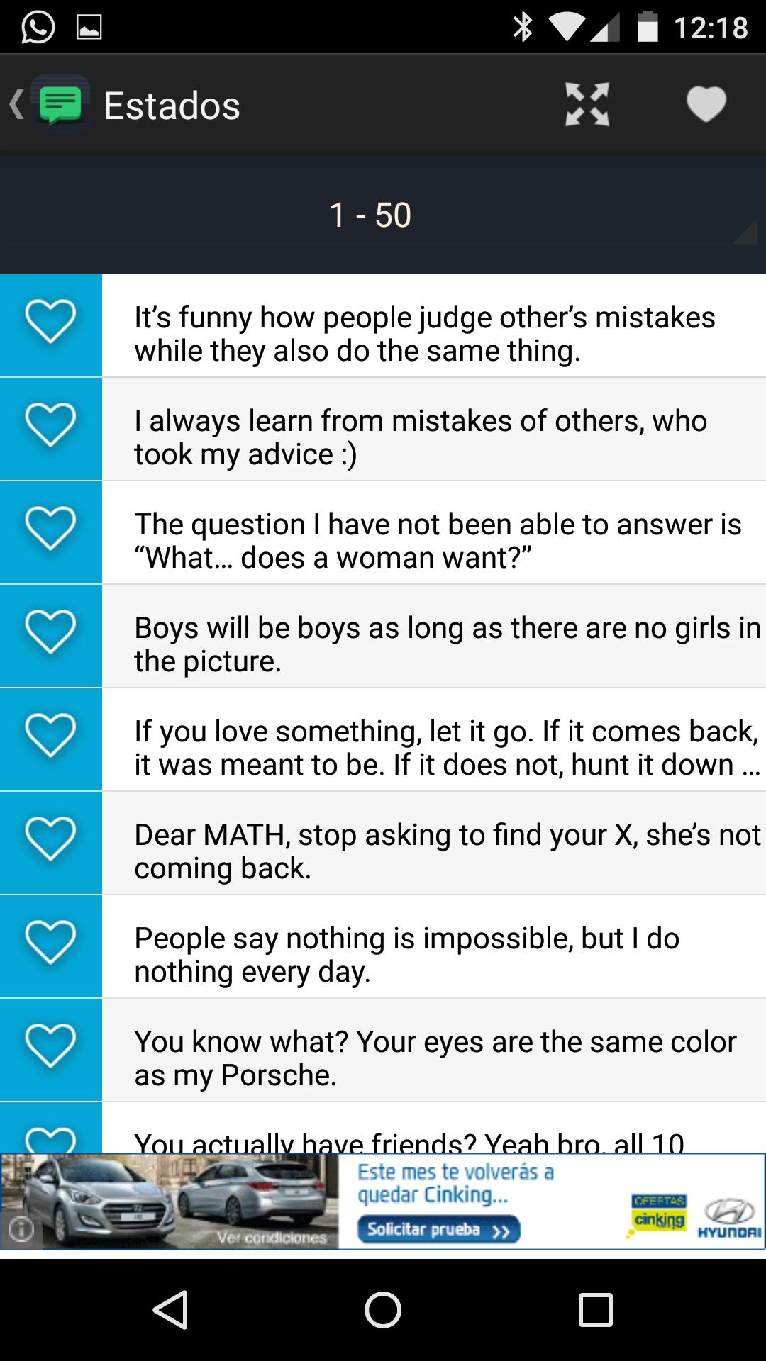 Status and phrases to share in Whatsapp, Facebook, Twitter. Lot of kinds: love, friendship, laughs, funny.