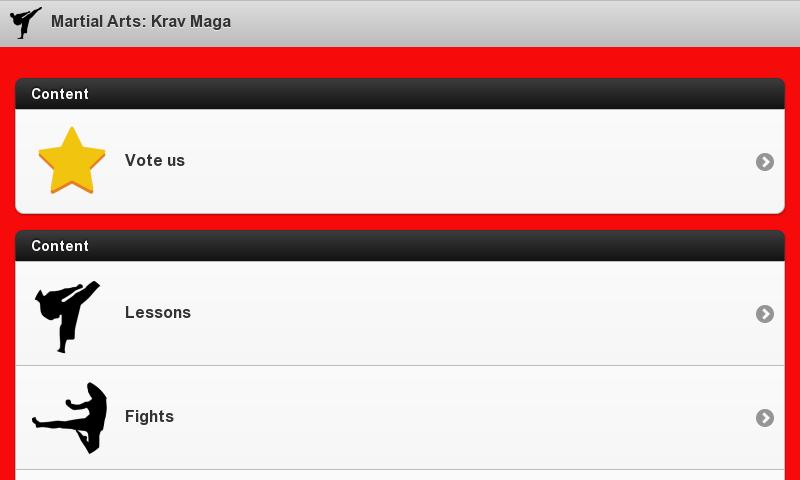 If you like Krav Maga,one of the most famous martial arts, you arrived to the number one Krav Maga app for mobile phone and tablets. Here you will learn all the Krav Maga techniques thanks to our video tutorials. Don't miss the techniques, the lessons and the fights sections. All of them have something to offer. Learn how to move and kick like a Krav Maga professional fighter. And all this for free. Learn martial arts today.