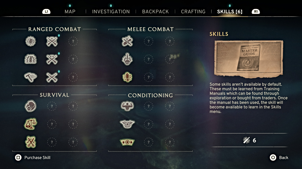 There are four different categories of skills in the game, including Ranged Combat, Melee Combat, Survival, and Conditioning. The first two are pretty self-explanatory and improve your skills with both types of weaponry. Meanwhile, Survival pertains to skills in gathering items, disarming traps, etc. Conditioning skills improve your physical resilience, such as increasing your health bar, heart rate recovery, etc.