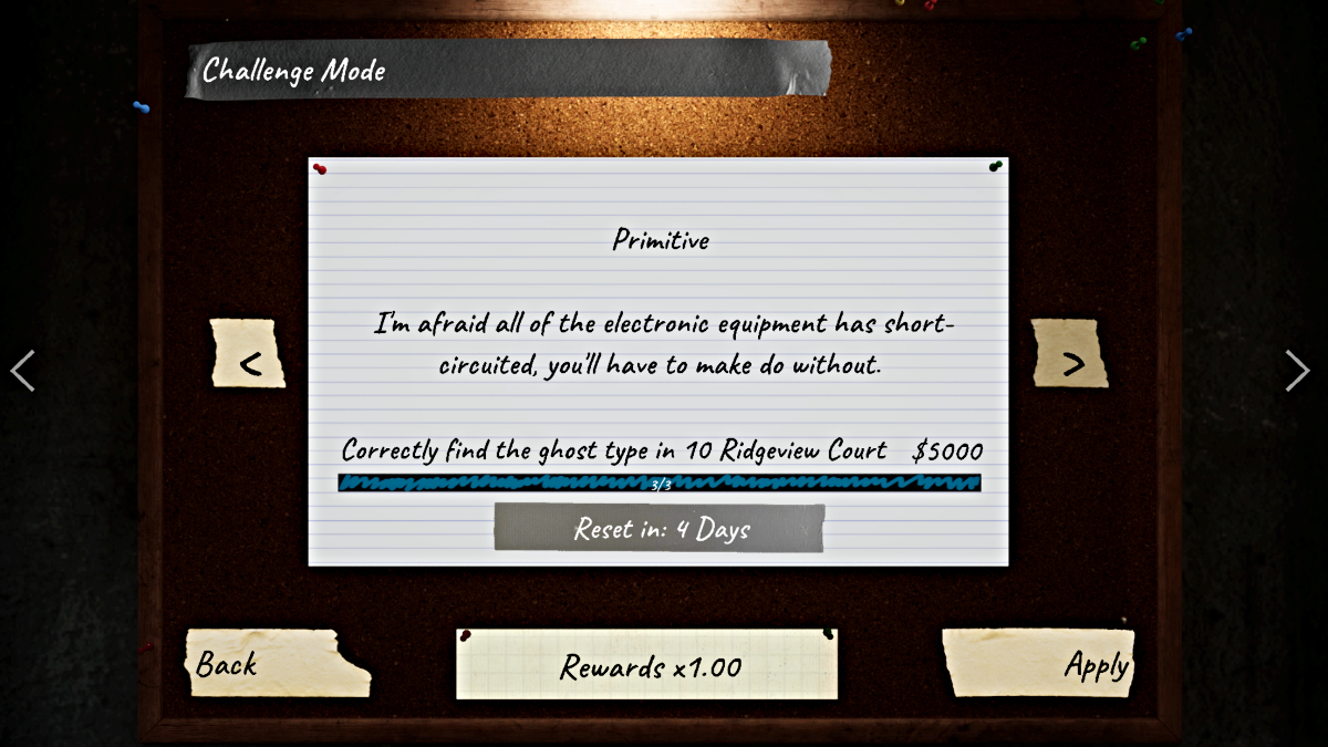 In addition, Sanity Medication has also been removed. Thankfully, you do start this challenge with a full meter of Sanity to help protect you (at least temporarily) against nefarious ghost behavior. The equipment you are given also includes two Tier 1 Crucifixes, meaning that you can prevent up to two ghost hunt attempts with them, if properly placed. Along with Tier 2 Firelights, a full set of Tier 1 Incense is also provided, for further protection.