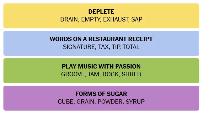 请记住 - 黄色是最容易找到的群体,其次是绿色和蓝色,紫色是最难连接的单词。